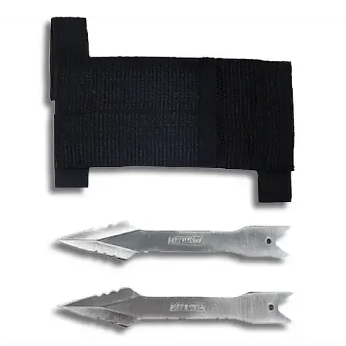 Our arrow throwing spikes measure 5.5" long and come in a set of two. They include a nylon carrying case that has elastic and Velcro straps for attaching to a belt or concealing on your forearm. These throwers are made from heavy duty stainless steel and have a really attractive brushed metal finish. Has the words 'Baby Master' stamped into the side.