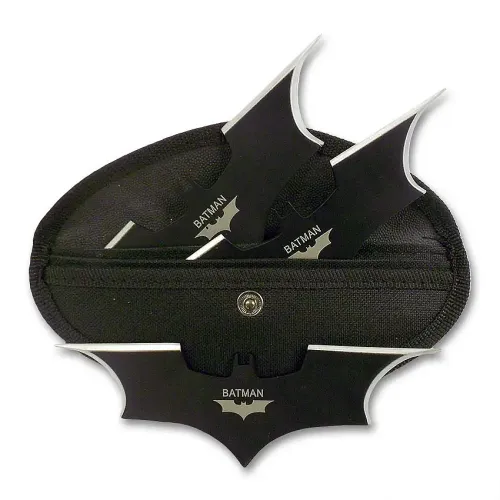 Be the coolest kid on the block with your Dark Wing Bat throwing knife set. This knife set contains three 6" long bat shaped knives with an etched bat symbol and stainless steel sharpened edges. With it you'll receive a black heavy duty nylon belt sheath that holds all three knives comfortably, and snaps open with a finger tip touch when you need to break out your weapons.