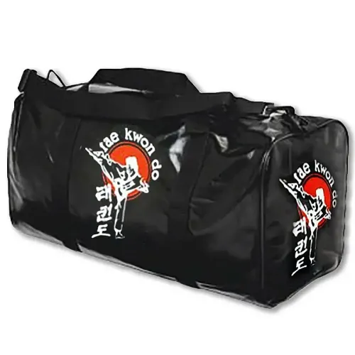 Black Taekwondo Sidekick Bag is ideal for anyone wanting to carry their clothes in a way that advertises their interest in the martial arts. In addition to the phrase "taekwondo" written on all sides in English and Korean, the bag also features a picture of a person kicking into the air. It has a single zipper, making for easy access. This martial arts bag is made of vinyl, a strong material that prevents spilled sports drinks from getting to your clothes.