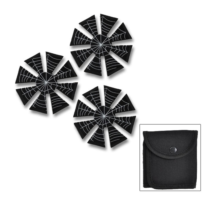 Our black widow webbed throwing stars are crafted perfectly for novice throwers. Veteran throwers will also love the unique design of these stars. Each spiderweb throwing star set comes with three stars and a nylon sheath for easy and safe carrying. Our stainless steel throwing stars measure approximately 3" in diameter with a medium weight for easier stick in targets.
