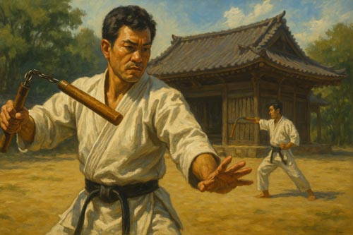 As the nunchaku evolved from its agricultural roots, it became an integral part of Okinawan kobudo, the traditional weapons system that developed alongside karate. Kobudo practitioners specialized in turning everyday tools into defensive weapons, and the nunchaku stood out for its speed, fluidity, and versatility. It could be used to strike, block, trap, or disarm an opponent, making it both practical and symbolic of Okinawan ingenuity.