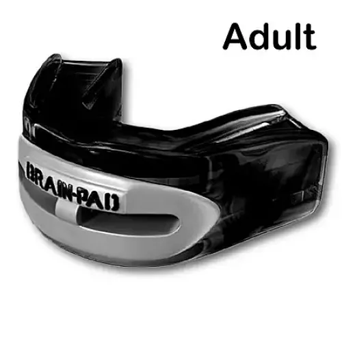 The patented Brain-Pad positions, secures, and cushions the lower jaw in a safety positions, reducing the risk of concussions from the lower jaw slamming into the TMJ, base of the skull and brain. Strap or no strap design. Comes with mouthguard, case, and two straps.