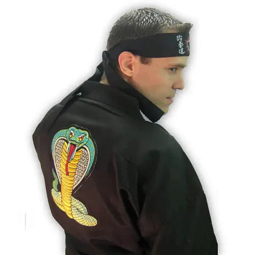 - Traditional black karate uniform with a beautifully detailed cobra patch attached to the back