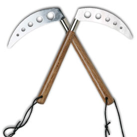 These 12" competition natural oak kama are perfect for tournaments and demos. They feature unsharpened 7" steel blades with holes that help reduce air resistance. The left and right handles are distinguished by the direction of the blade and the cuts on the handles. They have a black leather wrist cord to keep you from dropping them during fast spins.