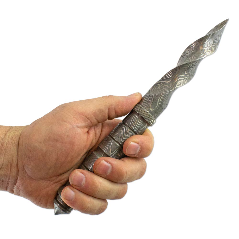 These spiral metal spikes are about 10 inches long with a 5-inch twisted metal blade. The layering of folded metal makes for the swirled Damascus pattern all throughout the metal, not just a surface level decoration. This also means that the steel is heat treated for extreme edge retention and durability. Complete with a leather sheath, this twisted blade knife has the look of a medieval assassin's weapon of choice!