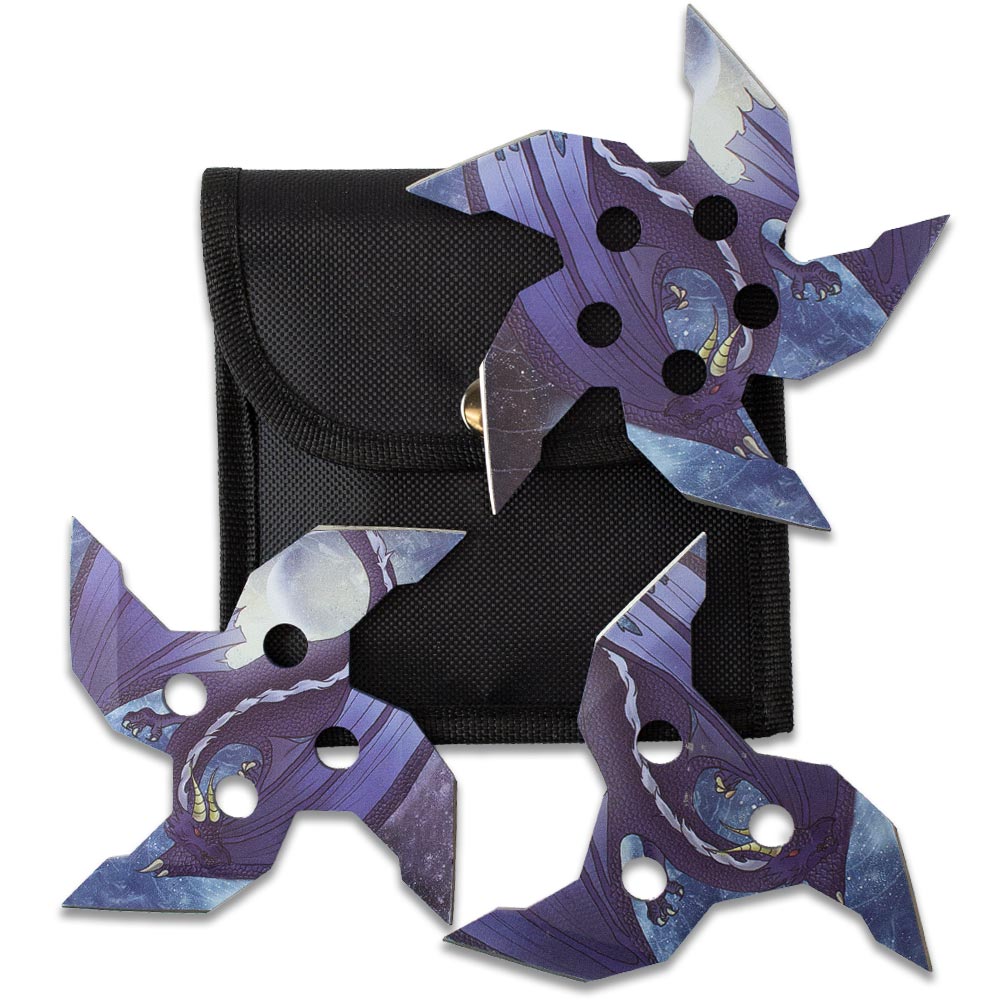 Dragon Throwing Star Set is a triple threat to your enemies, target, or that old tree stump out back. Far from the dark and covert ninja stars you already have, these blue printed steel shuriken are going to turn heads.