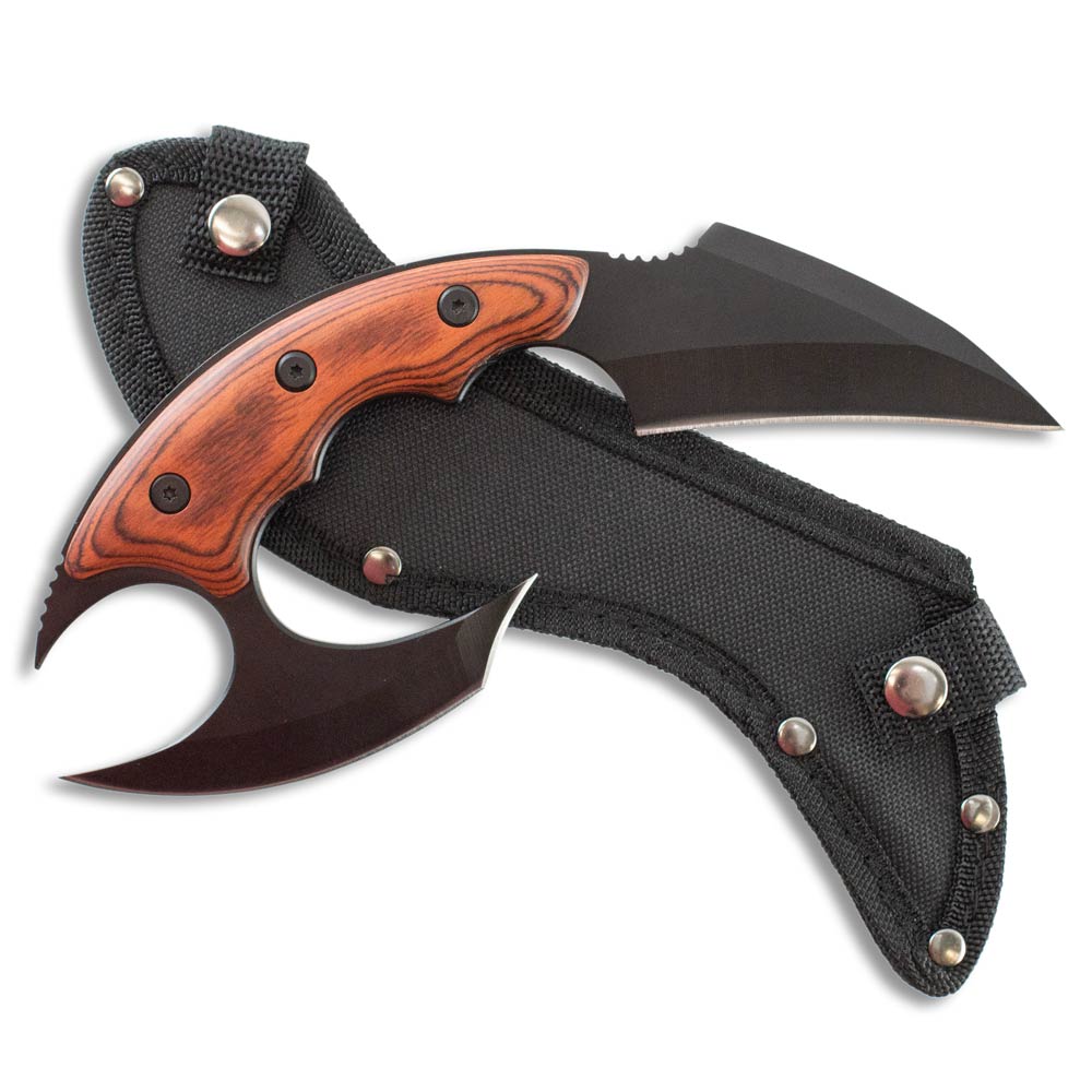 screams karambit, it does not have a closed ring at the end to qualify as one. But the way the curved pommel spike and fist blade curl close to each other, it is easy to mistake it as one. The pointed blade is just like the iconic claw that comes with many tactical knives. Even with a second blade, this dual cutter will slice through just about anything you put in front of it! Breaking it down, the two different shapes of sharpened steel have fine edges, so you can cut from many directions. If you grab the handle in forward grip, the spear-like 3 1/2" talon blade points outwards, and the rounded 4" blade is pointed away from your hand over your knuckles. In this grip position, you would turn a sucker punch into a shark bite! But you can change to reverse grip, moving it perpendicular to your hand, and having the domed blade as the primary and the claw extending out of your palm. It's your knife, the choice is yours!