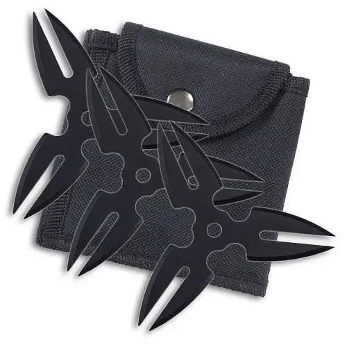 Each of the three stars is fashioned like a three-point star, though the points are actually two points coming together like a two-pronged fork. That's extra pokiness for you. The four-inch diameter shuriken are lightweight (weighing just 2 ounces) and aerodynamic, so you know they'll have plenty of sticking power, whether you are targeting an opposing feudal lord or a cardboard target nailed to a tree.