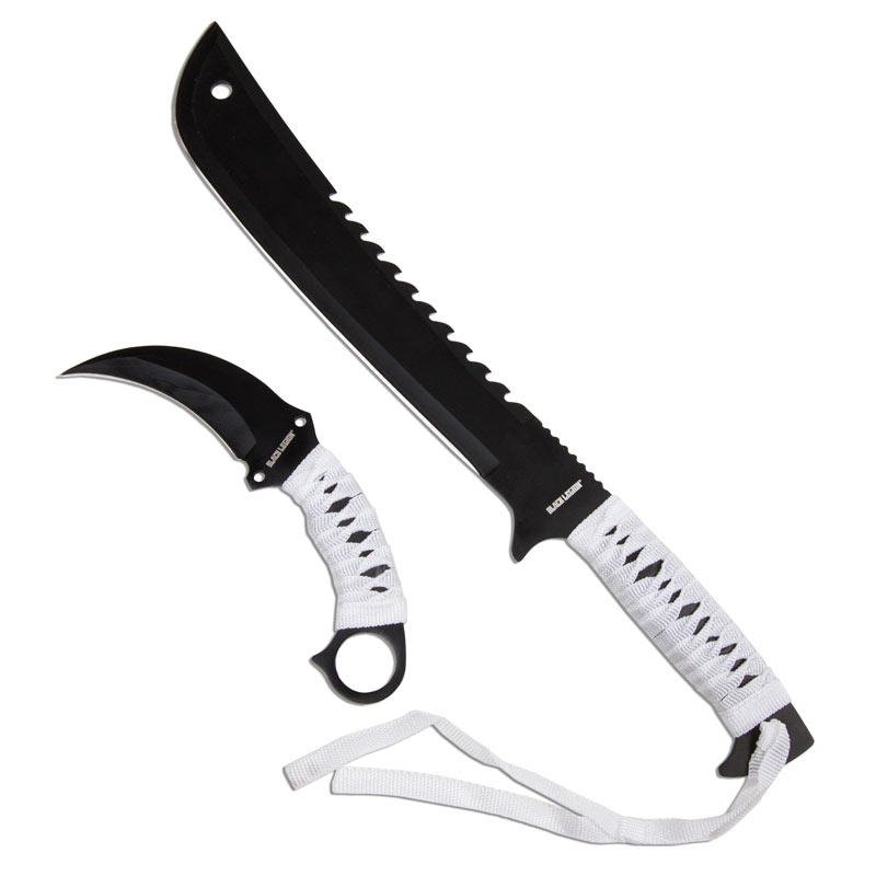 Ghost Twin Knife Set. This pair of black and white knives combines the deadly power of a 17" Bowie knife with an 8" karambit for close-up attacks.