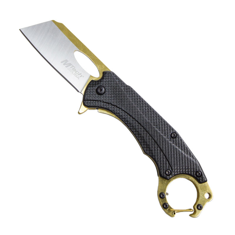 Golden Carabiner Pocket Knife is that knife. As the name suggests, this spring-assisted knife has a special metal link at the pommel, useful for clipping the knife to ropes or belt loops. This is useful, but there is so much more to this golden knife than just your ability to carry it with ease.
