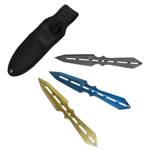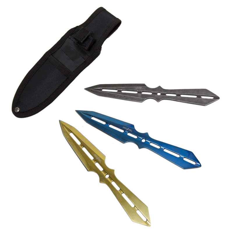 The first is a blue anodized color. It is said that this blue throwing knife allows its wielder to increase their speed and violate the laws of physics to alter the distance between them and their target, but it's actually just a throwing knife. Similarly, the gold throwing knife in this set is rumored to enhance your aim by giving you the ability to predict where your target will move. Again, this is just a rumor that we have so far been unable to corroborate. An old wive's tale says that the final stone wash throwing knife will enhance your physical strength as you throw it. We have been unable to replicate this in our experiments.