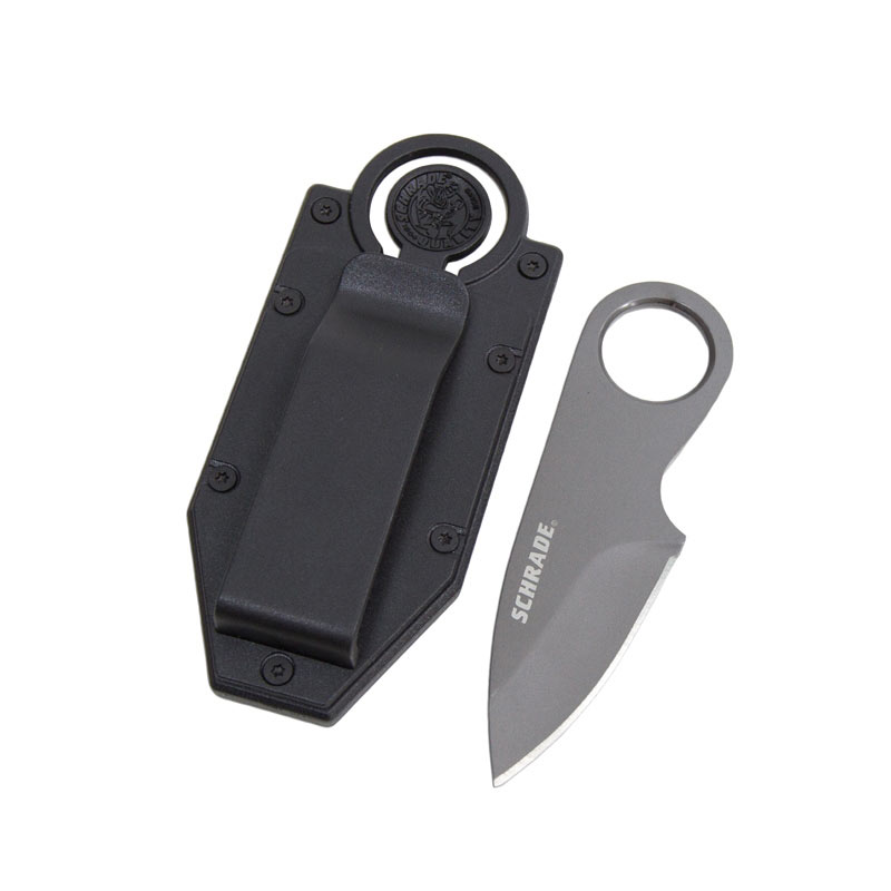 This tiny knife comes with an equally tiny sheath, which clips onto your belt, pocket, boot, or shirt. This thermoplastic sheath is even designed to let you snap the knife into place via the handle's finger ring.