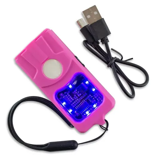 What really sets this pink stun gun apart is the transparent window in the body that reveals the internal circuitry. When the stun function is activated, the circuit board lights up in a vivid blue glow. It is not just cool to look at, it is functional. That flash of electric light is an unmistakable warning signal. In many real-world situations, the visual alone can be enough to make someone rethink their choices. It creates a moment of hesitation, and that moment matters.