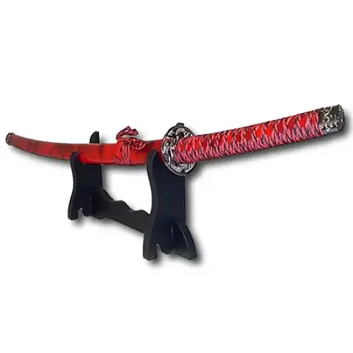 Our red smoke katana measures 36 1/2 inches overall with a 26 inch blade. The scabbard is finished in red lacquer with a smoke detail (it looks as though it has passed through the flame of an oil lamp). Silver hardware and trim pieces with black and red cord wrapping on the handle and scabbard. Wavy design on the blades edge replicates the look of a sword that's been made in the traditional way.