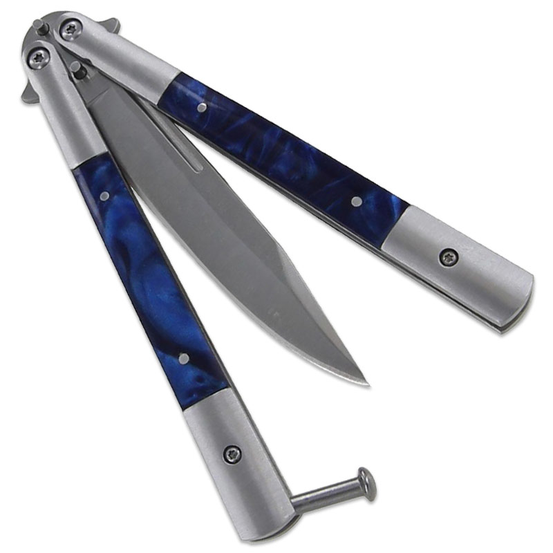 The drop point blade is made out of stainless steel and measures 3 and a half inches. Along with the 5" handle, which has a blue ABS insert, the whole balisong measures 9 inches when open. The blue steel butterfly knife weighs only 5 ounces.