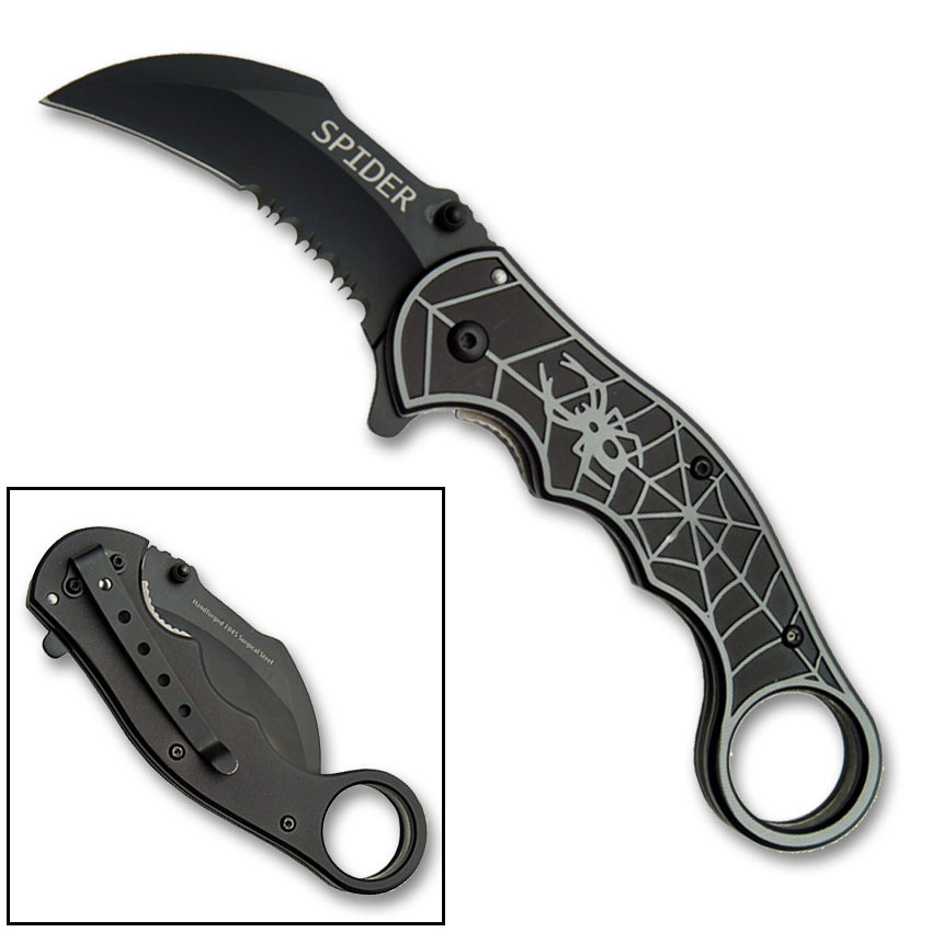 The silver spider folding karambit has a unique machined spider design with a subtle texture that improves the users grip.