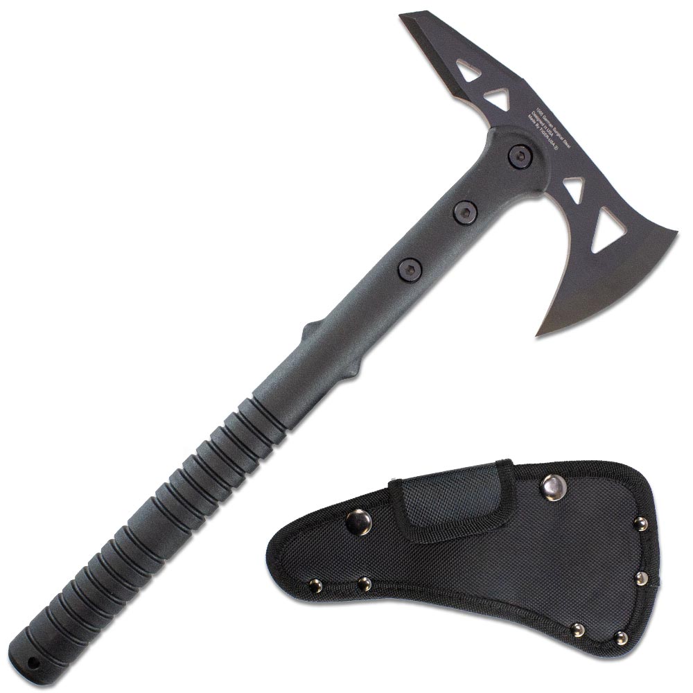 do want it to fly, then line it up and let the steel go! The weight of these axes is all in the steel at the top, with a tang that travels at least 4 inches into the nylon fiber handle. This means you can get some good spins in during a throw, but you'll have to work on technique to land the blade instead of the handle. When not throwing or chopping away at stumps of wood, then snap on the protective sheath and loop some cord or a tactical belt through the strap on the back for carrying. This all stealth tomahawk is a sleek modern weapon good for many trips into the woods, so grab one for each hand and start exploring!