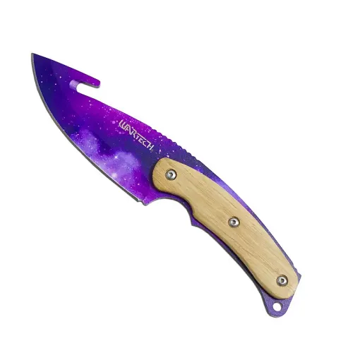 Stellar Hook Knife, you will be monumentally prepared for whatever challenges face you in the wild. This 8 oz hunting knife has a 5" stainless steel blade that has been given a thin coat that looks like a magenta star field. When we called them up, astronomers told us that stars can't actually be magenta but we figure a little artistic license on a knife blade wouldn't kill anyone.