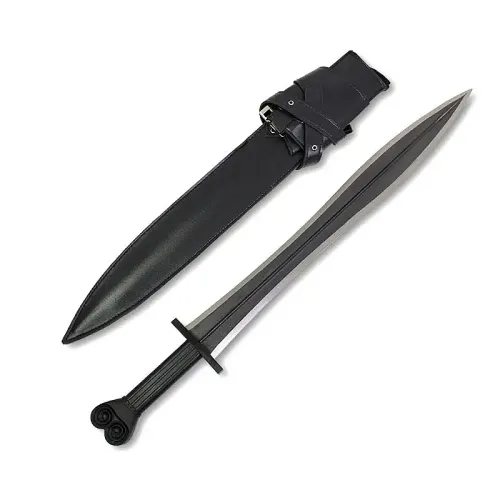 The 8" handle is made out of a zinc alloy and is designed to immitate the ionic style of ancient weapons and architecture. This handle, along with the leather sheath, gives this heavy-duty sword an authentic look to fit in your period piece film or ancient world themed costume party. Be careful, though, the blade is fully sharpened and if you find barbarians at the gate of your party, you'll certainly be well-equipped to deal with them.