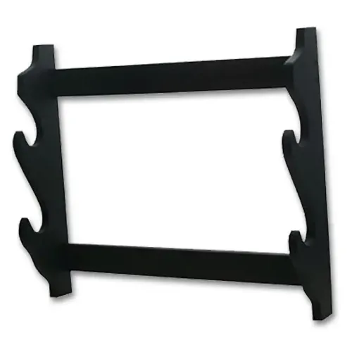 Need a place to display your swords, but don't want to use valuable desk/table space? Then look no further with this Two Sword Wall Rack! This display rack is intended to display your prized swords on the wall, so you can show off your weaponry, but still have space for other activities. The rack is made out of black colored wood and measures approximately 15" x 10" x 3". Also take a look at our selection of swords if you need another piece to display on this rack!