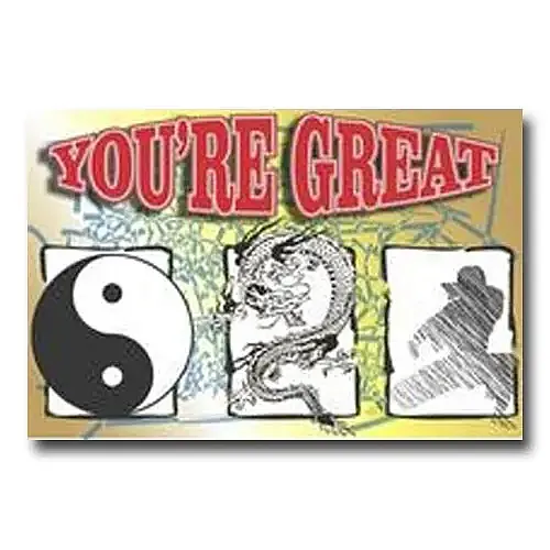 4" by 6" Postcard says "You're Great" Full color front, basic post card back. Features a yin yang, a dragon, and a karate pose silhouette design.