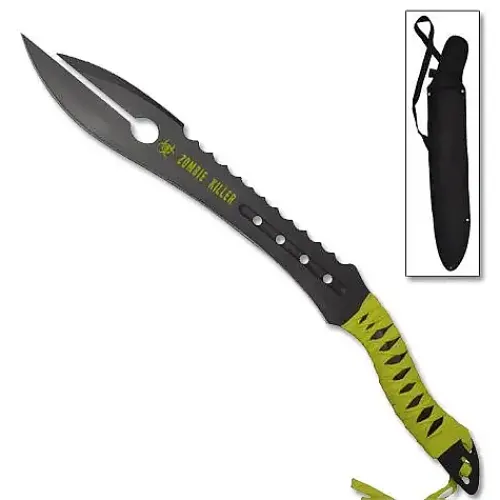The zombie gutter sword is perfect for people who take their zombie hunting seriously. It's not only a totally awesome machete style sword, but also has two gut wrenching tips to show those zombies who's boss. This sword is 25" long and has a faux leather handle covered by green ribbon. The sword is built from one solid piece of anodized black finish steel. It includes a nice nylon sheath with shoulder strap.